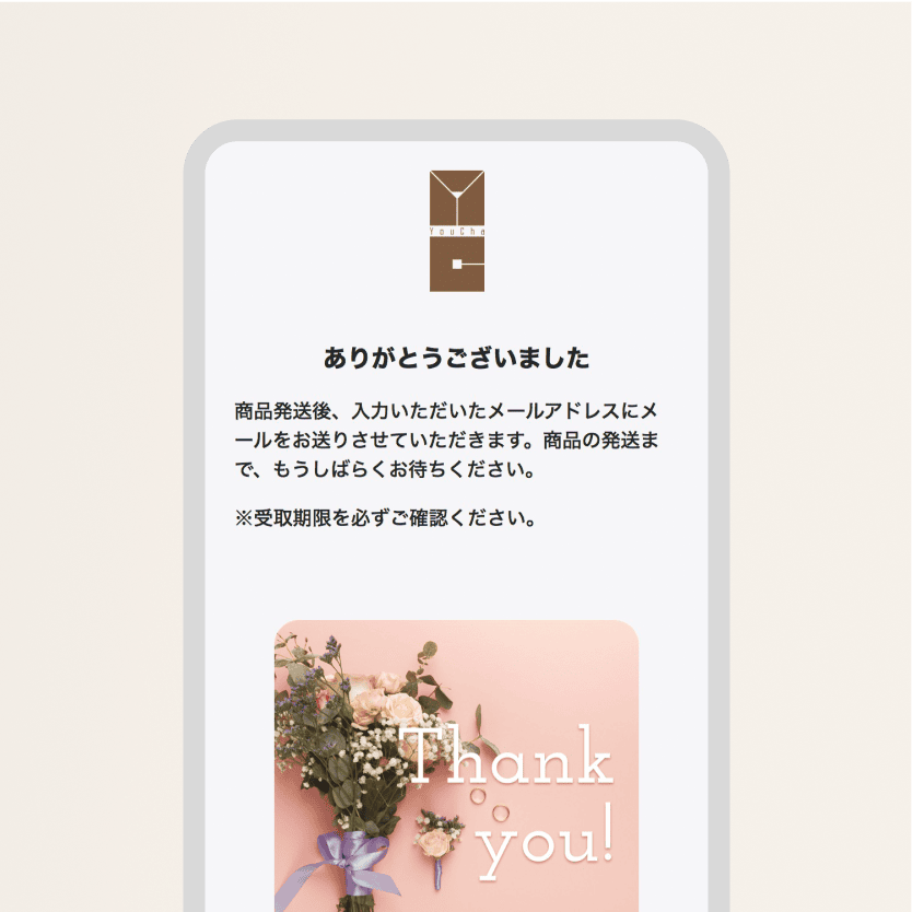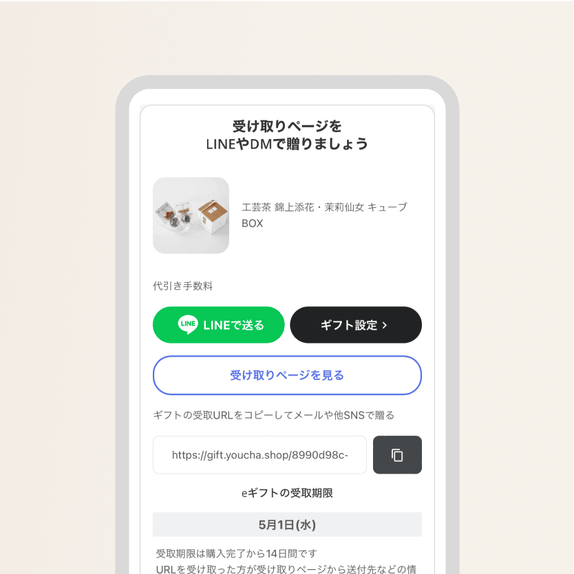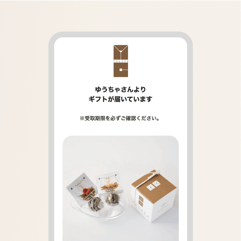 購入完了後に、購入完了画面に表示されます。また、通常の注文完了メールとは別のメールで、eギフトのURLが載ったメールが送られます。メールの件名は「遊茶オンラインショップ:ギフトURLのお知らせ」となります。