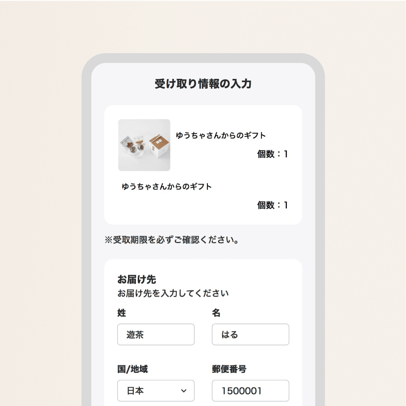 受け取る方が住所を入力しなかった場合の送付先として、ご購入者様のご住所の入力をお願いしております。