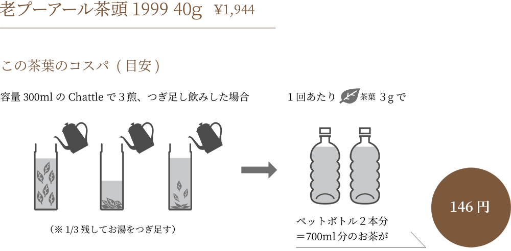 1999年製のプーアール茶の“熟茶”。ただ丸いとか厚みがあるというだけではない、20年を超える歳月に育まれた潤いのあるコクが、優しく諭すように心まで優しく包み込んでくれるようです。茶頭は原料茶が若いゆえ、微生物による発酵過程で塊になってしまったお茶。“熟茶”の製茶工程でほぼ発生する現象とはいえ、数量は限られており、それなりに希少価値のあるお茶と捉えることができ、中でもこの年月を経たお茶はそうそう見つかりません。